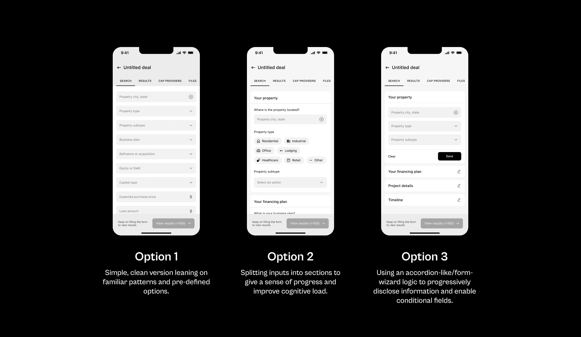 - Option 3: Used accordions and a progressive disclosure model. Helped focus but increased interaction cost.