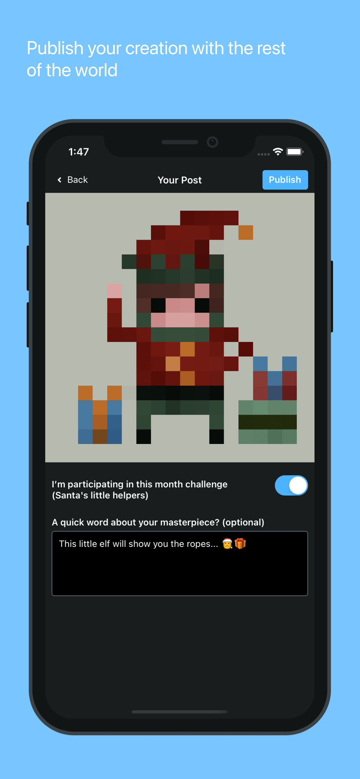 Create anything you want within a 16x16 pixels canvas, participate into monthly challenges and discover art from other users.