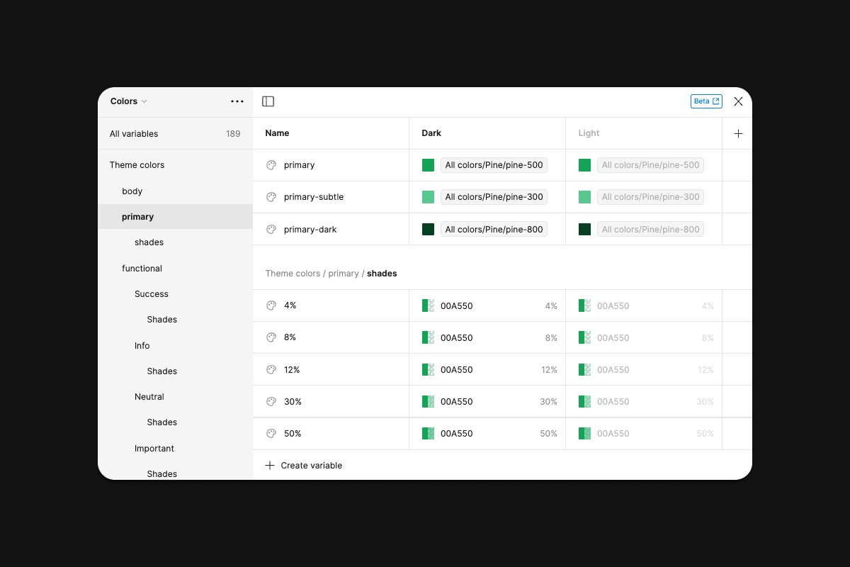 Building the design system went smoothly. I began by focusing on styles, then moved on to layout and components, and finally addressed templates and design resources. Shortly after I started, Figma released a major update introducing variables and a new dev mode. I leveraged these new features to support potential future light mode. By assigning colors, radii, and spacings to variables, I ensured components were easy to use, including many Booleans, text variables, and comprehensive documentation.